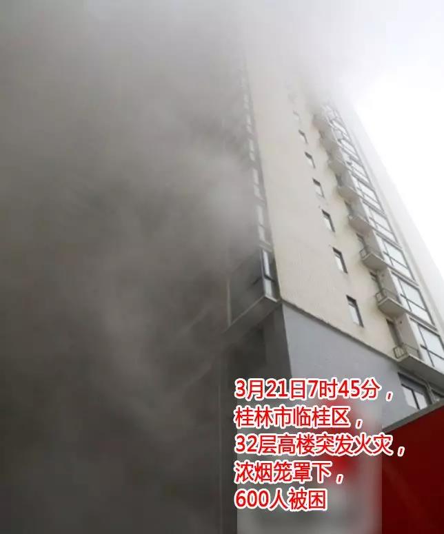 3月21日上午7時(shí)45分,桂林市臨桂區(qū)世紀(jì)東路奧林匹克領(lǐng)峰陽(yáng)光小區(qū)突發(fā)火災(zāi),據(jù)悉,起火建筑為32層鋼筋混泥土結(jié)構(gòu)的高層住宅,兩棟相連共有558戶,起火部位位于1棟2單元3樓電纜井,起火現(xiàn)場(chǎng)濃煙幾乎已經(jīng)將整棟建筑籠罩,樓上有大量居民被困,呼喊求救聲此起彼伏,一旦這些被困居民因火災(zāi)濃煙而產(chǎn)生恐慌情緒和引發(fā)中毒現(xiàn)象,情況將變得萬(wàn)分危急、難以預(yù)料……