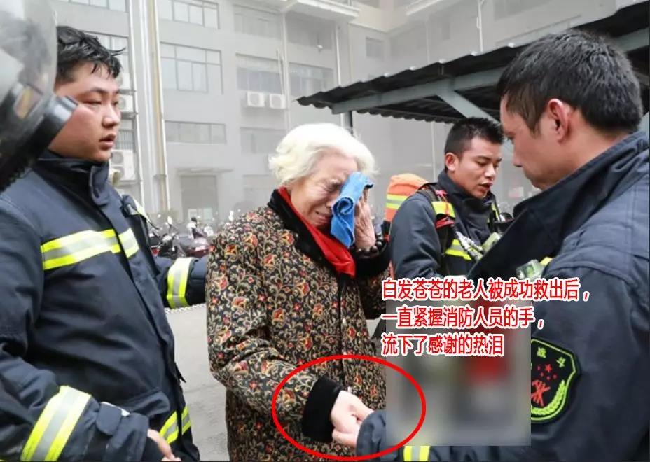 (↑↑↑圖為老人緊握消防員的手表示感謝)